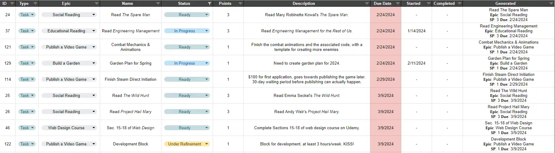 I got hit with the reading bug again in April, but opted to peck at my non-fantasy reading list instead. I finished Meditations, Engineering Management for the Rest of Us, and Accelerate in between then and now, and I recommend them all. It's also very satisfying to have my notes all in one place and linked together — which has kicked off a Herculean effort to pour all of my past notes (both professional and D&D related) into Obsidian.