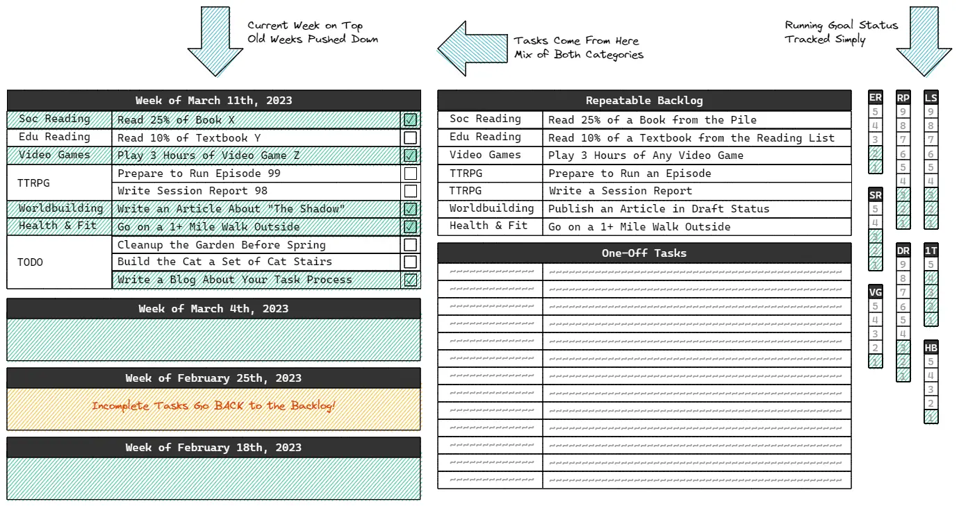 Don't let the goal status on the far right confuse you — I'm not expecting to read 5 textbooks in 2023, the bars just help me visualize what I've gotten done so that I don't have to continuously parse the task stream. My priority in this new setup is flow. I've found I can comfortably get about 10 tasks done each week, and so my focus is to keep that number more or less consistent (i.e. N=10). This has been helpful in terms of keeping my motivation up, because each week I'm able to predict what I'll get done, plan for it, and get the dopamine hit of checking all those boxes.