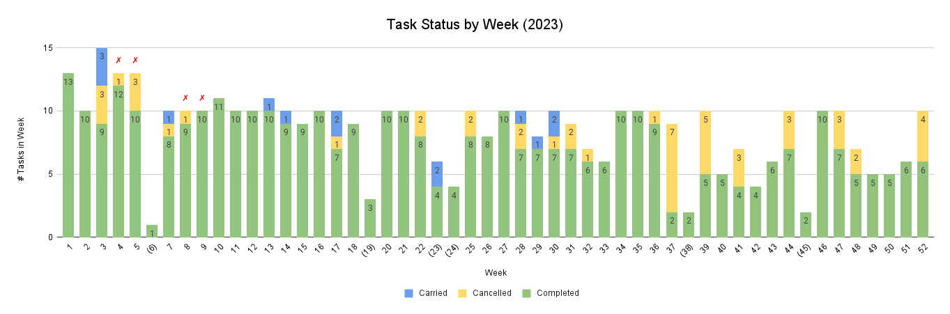 Above is a bar chart of tasks I've taken on per week in 2023, and whether they were completed (green), carried over (blue), or cancelled (yellow). The red X's mark where I broke my own rules, and took on more tasks than I should've. Weeks surrounded in parentheses are where I took a vacation or had a work trip.