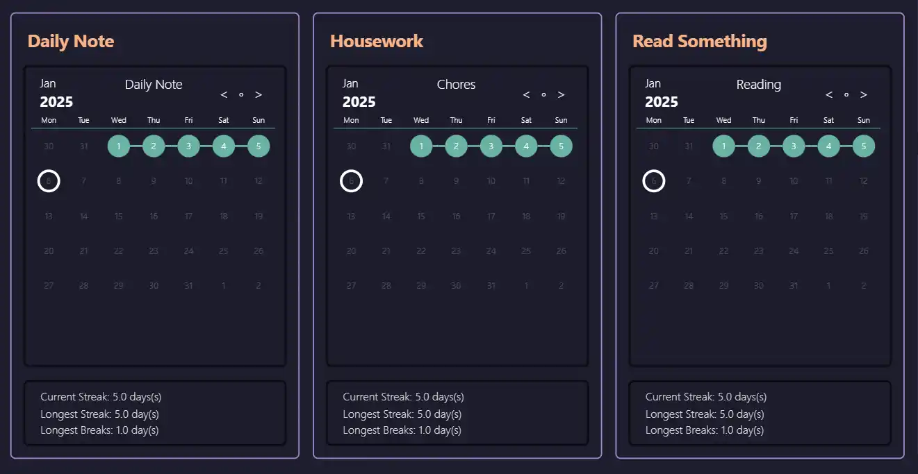 Anything else I get done in my personal life in 2025, I'll consider a "nice to have". Those four objectives are the only thing I'll be tracking daily, and my execution is fairly brain-dead: a checkbox in my daily note, and an aggregator showing my progress on a dashboard.